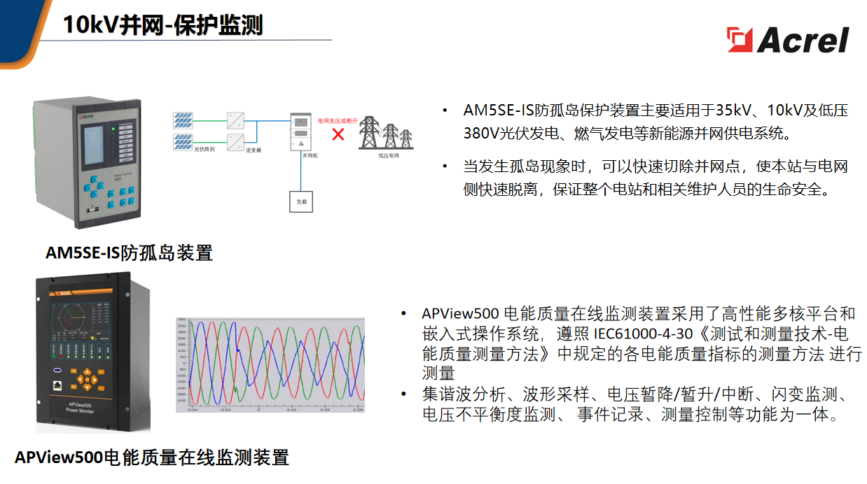 针对400kW~6000kW的光伏并网、6MW~30MW的储能接入,方案配备APM系列多功能表(实时监测电参量)、防孤岛保护装置(满足2s动作要求)与电能质量监测设备(数据存储超一年),同时通过能源管理平台实现远程运维——既符合《分布式电源接入电网技术规定》的并网要求,也能通过峰谷调峰项目收益,适配工业园区、大型厂房的集中式光储项目。