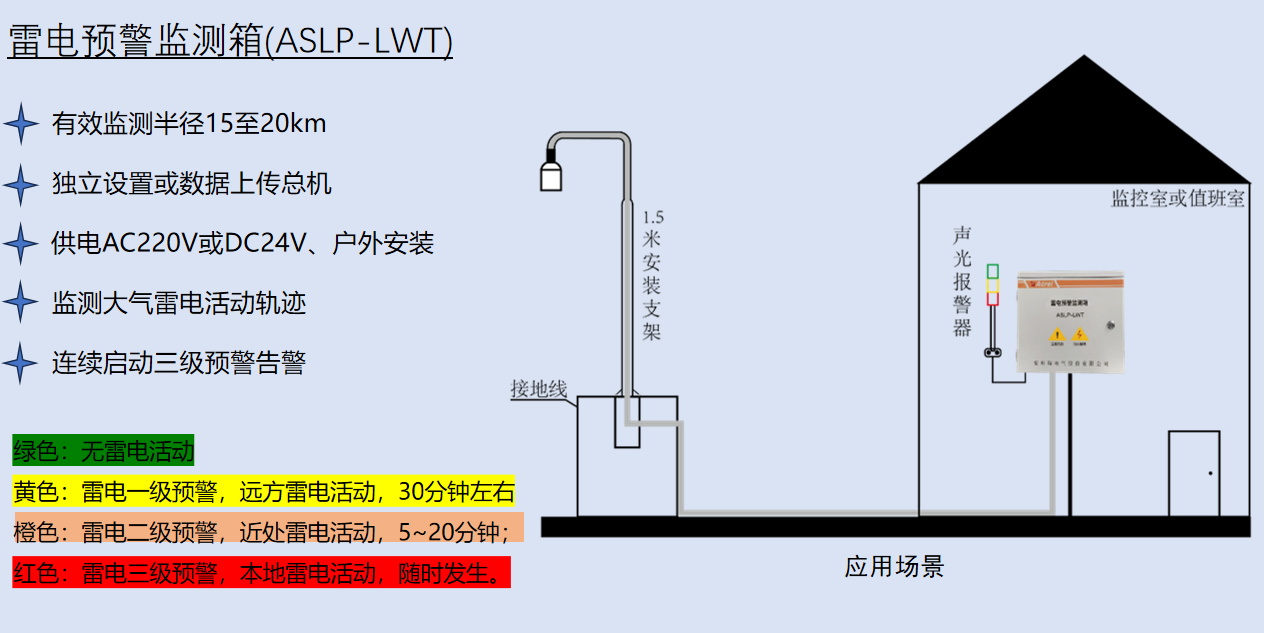 对于气象、航空航天、通讯基站、石油化工和易燃易爆场所,需要;连续监测大气电场强度,测量记录地面上静电场值与变化 率,能在雷击发生前的5~30分钟发出雷电预警告警信号,并实现连续启动三级雷电报警。