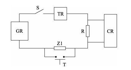 依据标准中对电气防火限流保护器电气性能测试的相关规定,短路限流测试电路如图1所示,过负荷保护测试电路如图2所示。图1和图2中的GR为电压源、TR为被测试样、S为单刀单掷开关、R为0.01Ω无感取样电阻、CR为示波器、T为按钮开关、Z1为3~6A阻性负载,图2中A为钳式电流表、Z2为25~50A阻性负载。