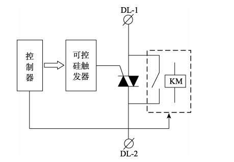 在进行短路限流测试时,接触器和双向可控硅构成短路支路。选用双向可控硅作为短路支路时,可以准确控制短路发生的相位角,但是因为可控硅导通时存在通态压降,在一定程度上会限制短路电流的增长。接触器在导通时电阻小,不会因为接触器的原因影响短路电流的大小,但是无法控制短路发生的相位角。当对短路发生的相位角有要求时,选用双向可控硅作为短路支路;当对短路发生的相位角没有要求时,选用接触器作为短路支路。短路支路硬件电路如图5所示,所选用的双向可控硅TRIAC型号为MTC1000A,额定电流1000A,额定电压1600V;可控硅触发器型号为SCR-Y,触发功率大,可以直接触发3000A以内的可控硅。在进行过负荷保护测试时,控制器控制可控硅触发器脉冲信号,双向可控硅不导通,或断开接触器,短路支路断开;在进行短路限流测试时,控制器控制可控硅触发器发出脉冲信号,使双向可控硅处于导通状态或闭合接触器,将负载短路。