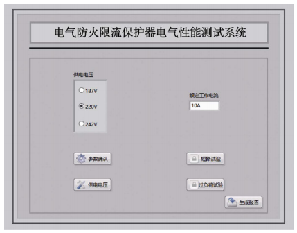 为了实现测试装置的研发与测试标准的报批同步进行,为标准正式出台后的顺利实施奠定基础。为此,在满足测试标准要求的测试方法基础上,进一步提高测试效率,降低测试成本,设计开发了一套基于LabVIEW的电气防火限流保护器电气性能自动测试装置,利用该测试装置可以实现对多种规格的电气防火限流保护器电气性能自动测试,测试内容包括短路限流测试、过负荷保护测试和电压波动测试。在测试结束之后自动生成测试报告,实现了对电气防火限流保护器电气性能测试的自动化和智能化。