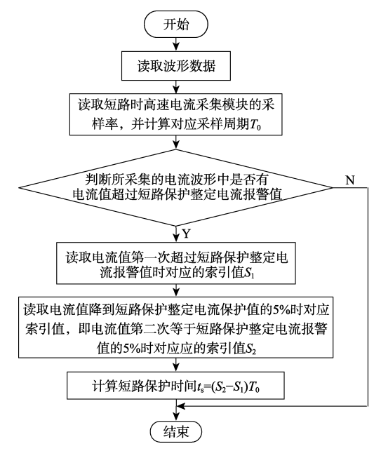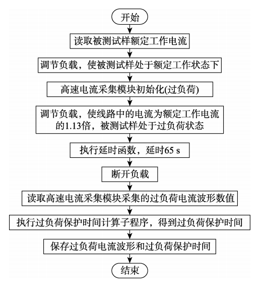过负荷保护时间为从流过保护器的负载电流值超过过负荷保护整定电流报警值时到负载电流降到其值5%时的时间间隔。过负荷保护时间计算子程序流程和短路限流时间计算程序类似,只是过负荷时高速电流采集模块的采样率和短路时设置不同。