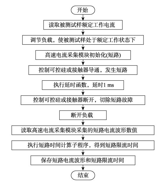 短路限流测试程序流程和过负荷保护测试程序流程分别如图8和图9所示。对测试装置的供电电压进行调整确认之后,在测试软件界面点击短路限流测试按键或过负荷保护测试按键,便可以进行短路限流测试或过负荷保护测试,执行相应的流程,得到短路电流波形、过负荷电流波形、短路限流时间和过负荷保护时间,并将波形和数据保存,用于后期生成测试报告。